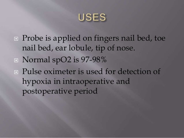 20. 20.  Probe is applied on fingers nail bed, toe nail bed, ear lobule, tip of nose.  Normal spO2 is 97-98%  Pulse oximeter is used for detection of hypoxia in intraoperative and postoperative period