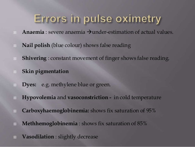 21. 21.  Anaemia : severe anaemia under-estimation of actual values.  Nail polish (blue colour) shows false reading  Shivering : constant movement of finger shows false reading.  Skin pigmentation  Dyes: e.g. methylene blue or green.  Hypovolemia and vasoconstriction - in cold temperature  Carboxyhaemoglobinemia: shows fix saturation of 95%  Methhemoglobinemia : shows fix saturation of 85%  Vasodilation : slightly decrease