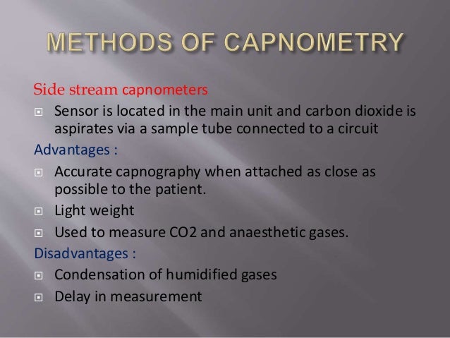 24. 24. Side stream capnometers  Sensor is located in the main unit and carbon dioxide is aspirates via a sample tube connected to a circuit Advantages :  Accurate capnography when attached as close as possible to the patient.  Light weight  Used to measure CO2 and anaesthetic gases. Disadvantages :  Condensation of humidified gases  Delay in measurement