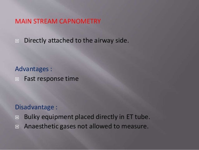 25. 25. MAIN STREAM CAPNOMETRY  Directly attached to the airway side. Advantages :  Fast response time Disadvantage :  Bulky equipment placed directly in ET tube.  Anaesthetic gases not allowed to measure.