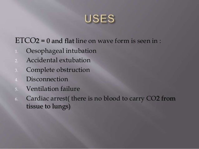 26. 26. ETCO2 = 0 and flat line on wave form is seen in : 1. Oesophageal intubation 2. Accidental extubation 3. Complete obstruction 4. Disconnection 5. Ventilation failure 6. Cardiac arrest( there is no blood to carry CO2 from tissue to lungs)