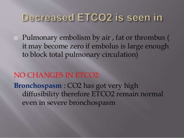 27. 27.  Pulmonary embolism by air , fat or thrombus ( it may become zero if embolus is large enough to block total pulmonary circulation) NO CHANGES IN ETCO2: Bronchospasm : CO2 has got very high diffusibility therefore ETCO2 remain normal even in severe bronchospasm