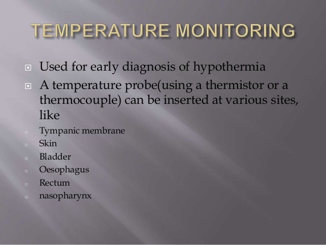 29. 29.  Used for early diagnosis of hypothermia  A temperature probe(using a thermistor or a thermocouple) can be inserted at various sites, like o Tympanic membrane o Skin o Bladder o Oesophagus o Rectum o nasopharynx