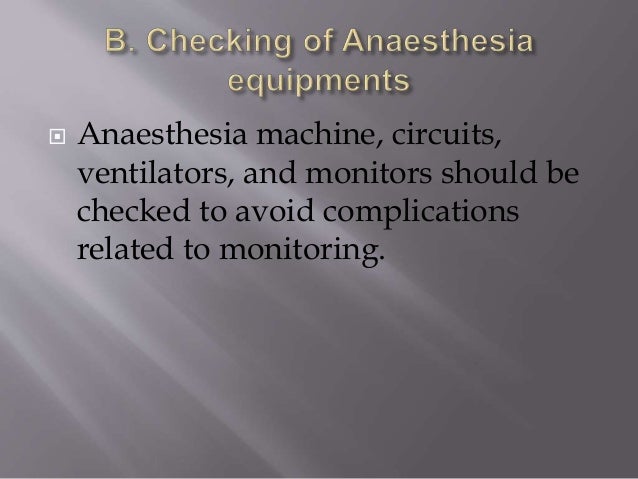4. 4.  Anaesthesia machine, circuits, ventilators, and monitors should be checked to avoid complications related to monitoring.