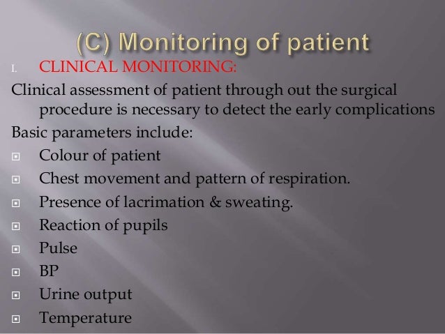 5. 5. I. CLINICAL MONITORING: Clinical assessment of patient through out the surgical procedure is necessary to detect the early complications Basic parameters include:  Colour of patient  Chest movement and pattern of respiration.  Presence of lacrimation & sweating.  Reaction of pupils  Pulse  BP  Urine output  Temperature
