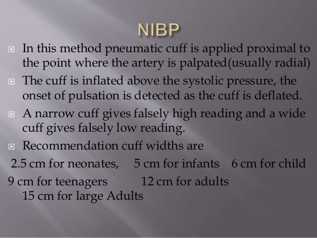 8. 8.  In this method pneumatic cuff is applied proximal to the point where the artery is palpated(usually radial)  The cuff is inflated above the systolic pressure, the onset of pulsation is detected as the cuff is deflated.  A narrow cuff gives falsely high reading and a wide cuff gives falsely low reading.  Recommendation cuff widths are 2.5 cm for neonates, 5 cm for infants 6 cm for child 9 cm for teenagers 12 cm for adults 15 cm for large Adults