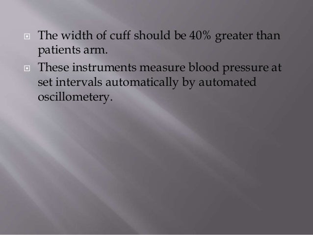 9. 9.  The width of cuff should be 40% greater than patients arm.  These instruments measure blood pressure at set intervals automatically by automated oscillometery.