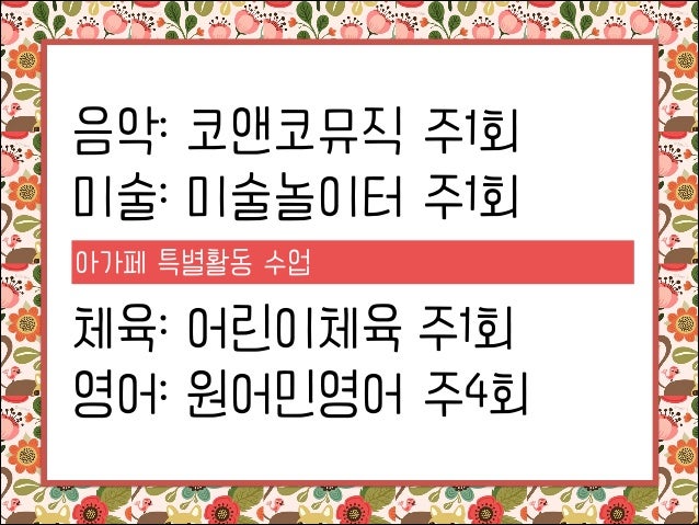 10. 10. 음악: 코앤코뮤직 주1회 미술: 미술놀이터 주1회 아가페 특별활동 수업 ! 체육: 어린이체육 주1회 영어: 원어민영어 주4회
