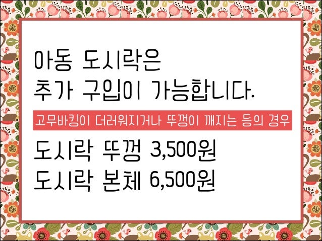 11. 11. 아동 도시락은 추가 구입이 가능합니다. ! 고무바킹이 더러워지거나 뚜껑이 깨지는 등의 경우 도시락 뚜껑 3,500원 도시락 본체 6,500원