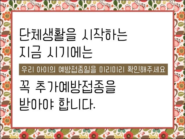 12. 12. 단체생활을 시작하는 지금 시기에는 ! 우리 아이의 예방접종일을 미리미리 확인해주세요 꼭 추가예방접종을 받아야 합니다.