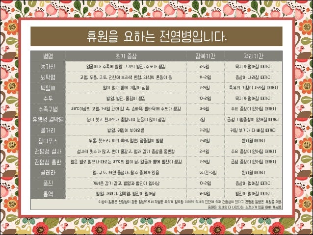 14. 14. 휴원을 요하는 전염병입니다. 병명 초기 증상 잠복기간 격리기간 농가진 얼굴이나 수족에 쌀알 크기의 발진, 수포가 생김 2-5일 딱지가 떨어질 때까지 뇌막염 고열, 두통, 구토, 전신에 보라색 반점, 의식의 혼동이 옴 14-21일 증상이 사라질 때까지 백일해 열이 없고 밤에 기침이 심함 7-14일 특유의 기침이 사라질 때까지 수두 발열, 발진, 물집이 생김 10-21일 딱지가 떨어질 때까지 수족구병 38℃이상의 고열, 1-2일 간에 입 속, 손바닥, 발바닥에 수포가 생김 3-6일 주요 증상이 없어질 때까지 유행성 결막염 눈이 붓고 흰자위가 충혈되며 눈꼽이 많이 생김 볼거리 발열, 귀밑이 부어오름 7-21일 귀밑 부기가 다 빠질 때까지 장티푸스 두통, 헛소리, 혀의 백태, 혈변, 장출혈이 발생 7-21일 완치될 때까지 전염성 설사 설사의 횟수가 많고, 변이 물같고, 열과 감기 증상을 동반함 2-4일 주요 증상이 없어질 때까지 전염성 홍반 열은 별로 없으나 때로는 37℃의 열이 남, 얼굴과 뺨에 발진이 생김 7-14일 급성 증상이 없어질 때까지 콜레라 열, 구토, 허연 물설사, 탈수 증세가 있음 6시간-5일 풍진 가벼운 감기 같고, 발열과 발진이 일어남 10-21일 증상이 없어질 때까지 홍역 발열, 재채기, 결막염, 발진이 일어남 9-13일 발진이 없어질 때까지 7일 급성 기염증상이 없어질 때까지 왼치될 때까지 이상이 질환은 전염성이 강한 질병으로써 각별한 주의가 필요함. 이외의 의사의 진단에 의해 전염성이 있다고 판명된 질병은 휴원을 요함. 등원은 의사의 다 나았다는 소견서가 있을 때에 가능함.