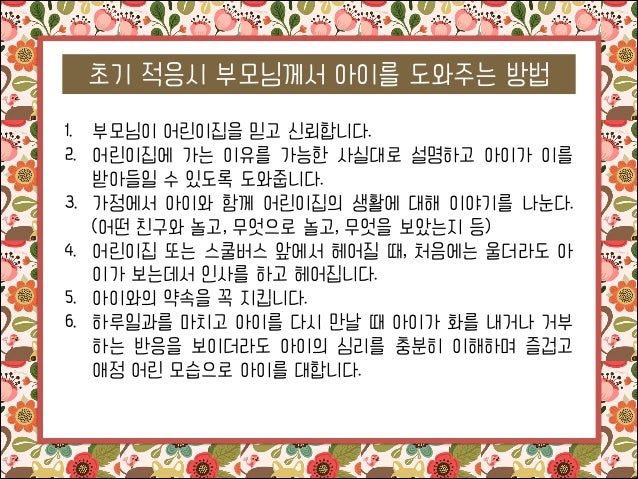 15. 15. 초기 적응시 부모님께서 아이를 도와주는 방법 1. 부모님이 어린이집을 믿고 신뢰합니다. 2. 어린이집에 가는 이유를 가능한 사실대로 설명하고 아이가 이를 받아들일 수 있도록 도와줍니다. 3. 가정에서 아이와 함께 어린이집의 생활에 대해 이야기를 나눈다. (어떤 친구와 놀고, 무엇으로 놀고, 무엇을 보았는지 등) 4. 어린이집 또는 스쿨버스 앞에서 헤어질 때, 처음에는 울더라도 아 이가 보는데서 인사를 하고 헤어집니다. 5. 아이와의 약속을 꼭 지킵니다. 6. 하루일과를 마치고 아이를 다시 만날 때 아이가 화를 내거나 거부 하는 반응을 보이더라도 아이의 심리를 충분히 이해하며 즐겁고 애정 어린 모습으로 아이를 대합니다.