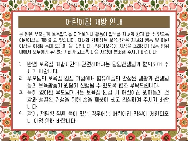 16. 16. 어린이집 개방 안내 본 원은 부모님께 보육일과를 지켜보거나 활동이 일부를 자녀와 함께 할 수 있도록 어린이집을 개방하고 있습니다. 자녀와 함께하는 보육경험은 자녀의 행동 및 어린 이집을 이해하는데 도움이 될 것입니다. 영유아보육에 지장을 초래하지 않는 범위 내에서 모두에게 유익한 기회가 되도록 다음 사항에 협조해 주시기 바랍니다. ! 1. 반별 보육실 개방시간과 관련하여서는 담임선생님과 협의하여 주 시기 바랍니다. 2. 부모님의 보육실 입실 과정에서 영유아들의 안정된 생활과 선생님 들의 보육활동이 원활히 진행될 수 있도록 협조 부탁드립니다. 3. 특히 영아반 부모님께서는 보육실 입실 시 어린이집 원아들의 건 강과 청결한 위생을 위해 손을 깨끗이 씻고 입실하여 주시기 바랍 니다. 4. 감기, 전염병 질환 등이 있는 경우에는 어린이집 입실이 제한되오 니 이점 양해 바랍니다.
