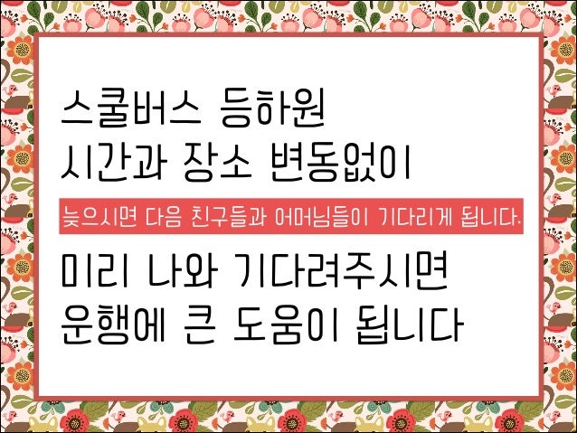 2. 2. 스쿨버스 등하원 시간과 장소 변동없이 늦으시면 다음 친구들과 어머님들이 기다리게 됩니다. ! 미리 나와 기다려주시면 운행에 큰 도움이 됩니다