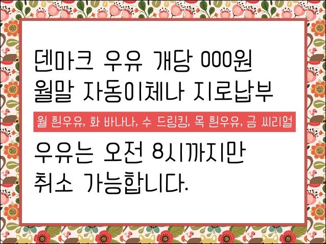 3. 3. 덴마크 우유 개당 000원 월말 자동이체나 지로납부 월 흰우유, 화 바나나, 수 드링킹, 목 흰우유, 금 씨리얼 ! 우유는 오전 8시까지만 취소 가능합니다.