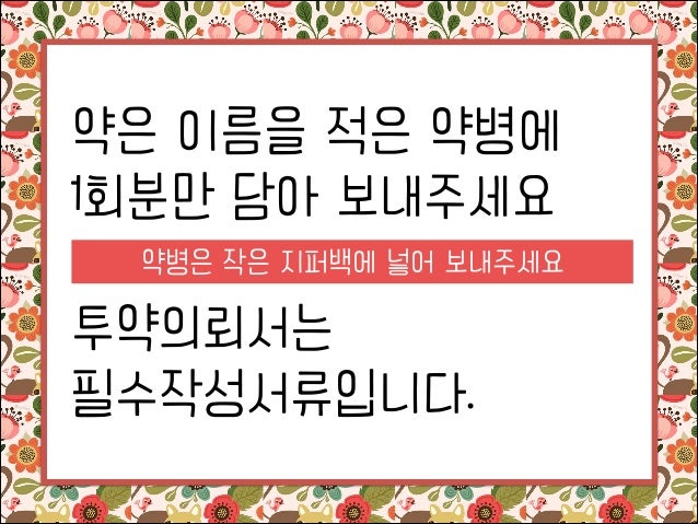 4. 4. 약은 이름을 적은 약병에 1회분만 담아 보내주세요 ! 약병은 작은 지퍼백에 넣어 보내주세요 투약의뢰서는 필수작성서류입니다.