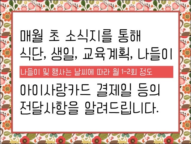 7. 7. 매월 초 소식지를 통해 식단, 생일, 교육계획, 나들이 나들이 및 행사는 날씨에 따라 월 1-2회 정도 ! 아이사랑카드 결제일 등의 전달사항을 알려드립니다.