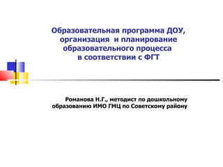 1. Образовательная программа ДОУ, организация и планирование образовательного процесса в соответствии с ФГТ Романова Н.Г., методист по дошкольному образованию ИМО ГМЦ по Советскому району