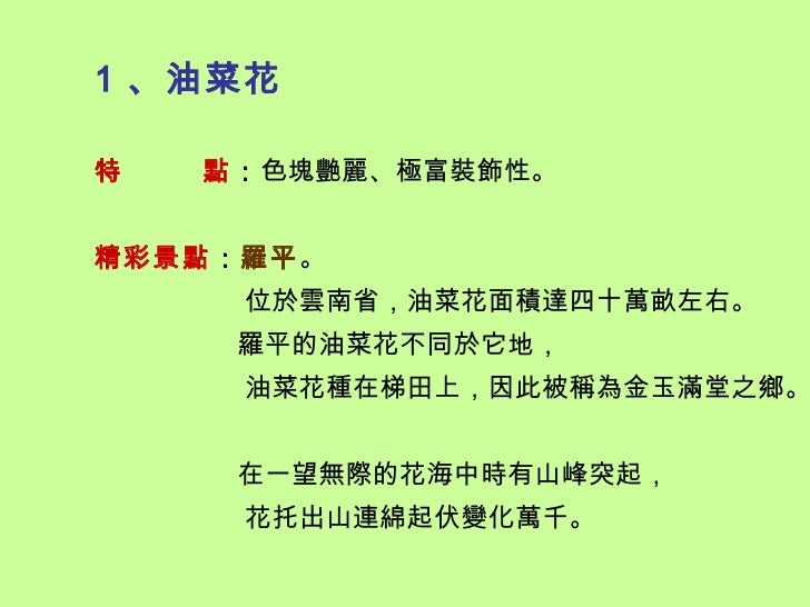2. 2. 1 、油菜花 特 點:色塊艷麗、極富裝飾性。 精彩景點:羅平。 位於雲南省,油菜花面積達四十萬畝左右。 羅平的油菜花不同於它地, 油菜花種在梯田上,因此被稱為金玉滿堂之鄉。 在一望無際的花海中時有山峰突起, 花托出山連綿起伏變化萬千。