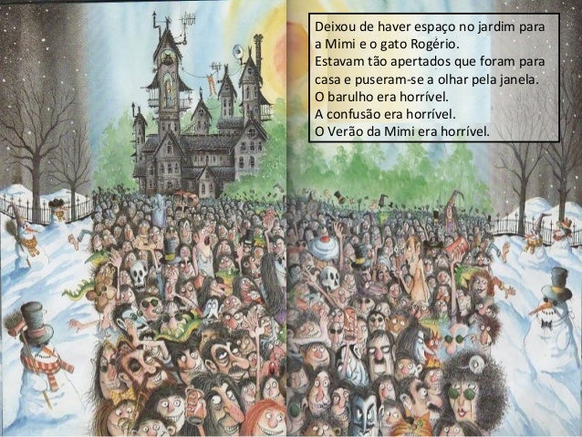 12. 12. Deixou de haver espaço no jardim para a Mimi e o gato Rogério. Estavam tão apertados que foram para casa e puseram-se a olhar pela janela. O barulho era horrível. A confusão era horrível. O Verão da Mimi era horrível.