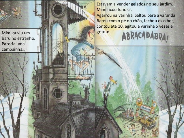 13. 13. Mimi ouviu um barulho estranho. Parecia uma campainha… Estavam a vender gelados no seu jardim. Mimi ficou furiosa. Agarrou na varinha. Saltou para a varanda. Bateu com o pé no chão, fechou os olhos, contou até 10, agitou a varinha 5 vezes e gritou: