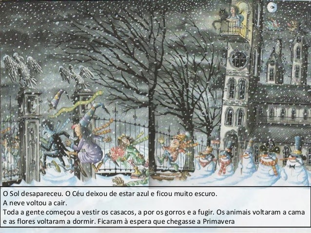 14. 14. O Sol desapareceu. O Céu deixou de estar azul e ficou muito escuro. A neve voltou a cair. Toda a gente começou a vestir os casacos, a por os gorros e a fugir. Os animais voltaram a cama e as flores voltaram a dormir. Ficaram à espera que chegasse a Primavera