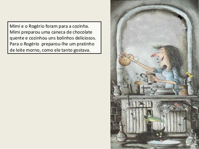 15. 15. Mimi e o Rogério foram para a cozinha. Mimi preparou uma caneca de chocolate quente e cozinhou uns bolinhos deliciosos. Para o Rogério preparou-lhe um pratinho de leite morno, como ele tanto gostava.