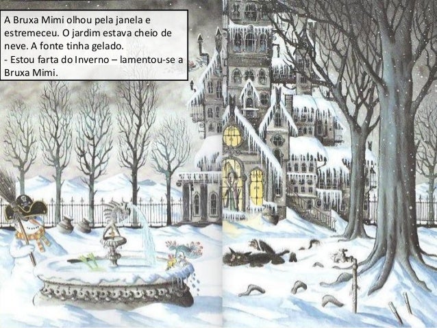 2. 2. A Bruxa Mimi olhou pela janela e estremeceu. O jardim estava cheio de neve. A fonte tinha gelado. - Estou farta do Inverno – lamentou-se a Bruxa Mimi.