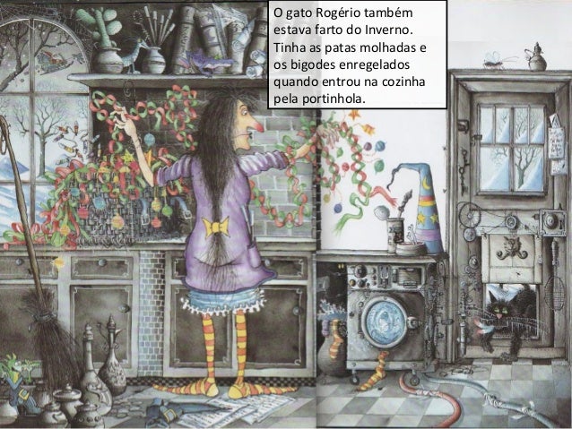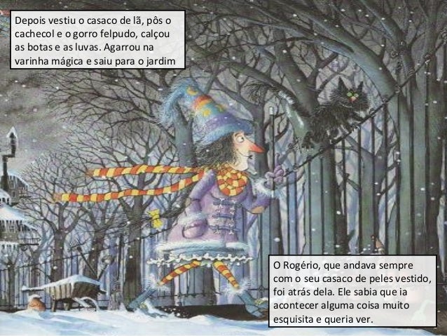 6. 6. Depois vestiu o casaco de lã, pôs o cachecol e o gorro felpudo, calçou as botas e as luvas. Agarrou na varinha mágica e saiu para o jardim O Rogério, que andava sempre com o seu casaco de peles vestido, foi atrás dela. Ele sabia que ia acontecer alguma coisa muito esquisita e queria ver.