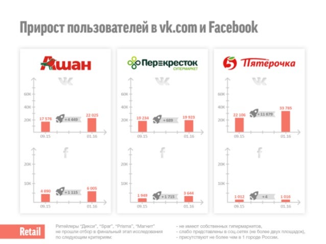 Анализ присутствия ритейлеров в социальных сетях позволил сделать вывод о том, что зачастую покупатели делятся своими отзывами на месте, т.е. используют для этого самую удобную площадку - Swarm*. Иными словами, важно учитывать активность клиента непосредственно на местах оказания услуг. В исследовании использовались открытые данные* из социальных сетей Facebook, Вконтакте, Twitter, Instagram, Foursquare и Swarm. Сбор данных производился с помощью #arg_tools: arg.tools.