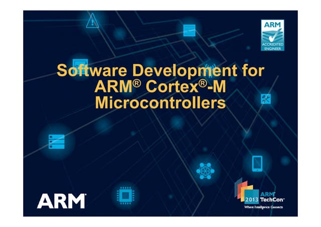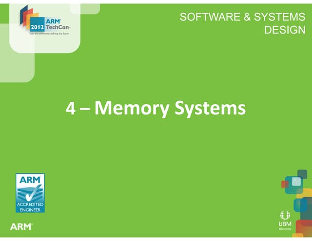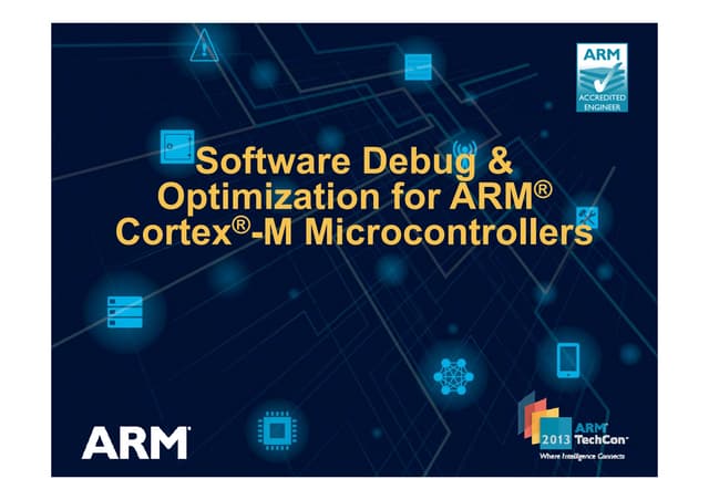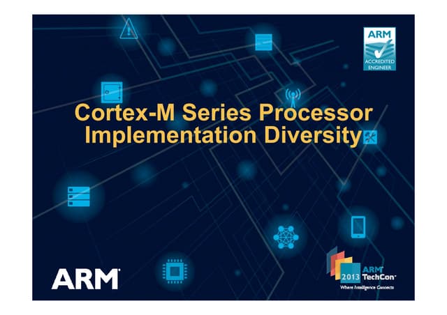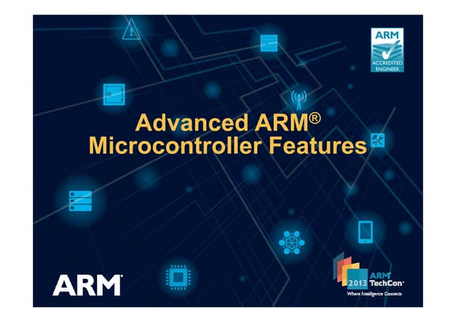 41. 41. PERFORMANCE MONITORING HARDWARE • ARMv7-A cores include a performance monitoring unit (PMU) • A PMU provides a non-intrusive method of collecting execution information from the core – Enabling the PMU does not change the timing of the core • The PMU provides: – Cycle counter – counts execution cycles (optional 1/64 divider) AAETC3v00 Instruction Sets 41 – Cycle counter – counts execution cycles (optional 1/64 divider) – Programmable event counters • The number of counters and available events vary between cores – The PMU can be configured to generate interrupts if a counter overflows • Some examples common to most cores: – Cache Hits or Misses, TLB Misses (on MMU cores), Branch prediction, correct/incorrect predictions, Number of instructions executed, etc… • Some events are architecturally defined while others are core-dependent – Check the ARM ARM and your core’s TRM for a full list