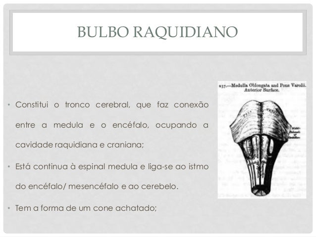 11. 11. •Constitui o tronco cerebral, que faz conexão entre a medula e o encéfalo, ocupando a cavidade raquidiana e craniana; •Está continua à espinal medula e liga-se ao istmo do encéfalo/ mesencéfalo e ao cerebelo. •Tem a forma de um cone achatado; BULBO RAQUIDIANO