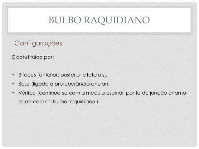 12. 12. Configurações É constituído por: •3 faces (anterior; posterior e laterais); •Base (ligada à protuberância anular); •Vértice (continua-se com a medula espinal, ponto de junção chama- se de colo do bulbo raquidiano.) BULBO RAQUIDIANO