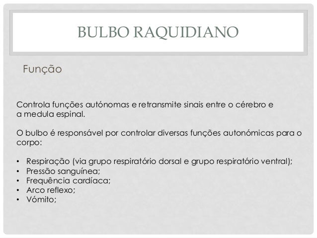 13. 13. BULBO RAQUIDIANO Função Controla funções autónomas e retransmite sinais entre o cérebro e a medula espinal. O bulbo é responsável por controlar diversas funções autonómicas para o corpo: •Respiração (via grupo respiratório dorsal e grupo respiratório ventral); •Pressão sanguínea; •Frequência cardíaca; •Arco reflexo; •Vómito;