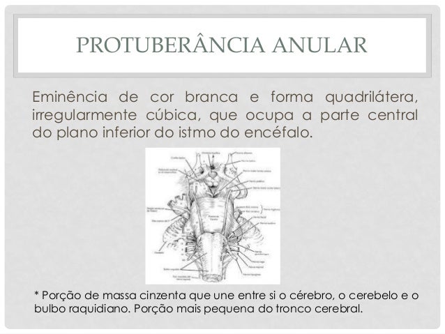 14. 14. PROTUBERÂNCIA ANULAR Eminência de cor branca e forma quadrilátera, irregularmente cúbica, que ocupa a parte central do plano inferior do istmo do encéfalo. * Porção de massa cinzenta que une entre si o cérebro, o cerebelo e o bulbo raquidiano. Porção mais pequena do tronco cerebral.