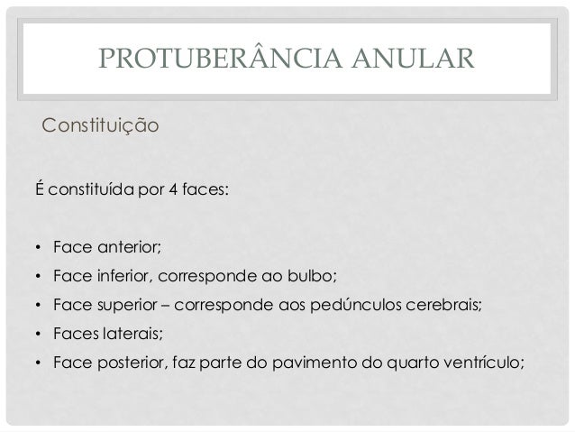 15. 15. Constituição É constituída por 4 faces: •Face anterior; •Face inferior, corresponde ao bulbo; •Face superior – corresponde aos pedúnculos cerebrais; •Faces laterais; •Face posterior, faz parte do pavimento do quarto ventrículo; PROTUBERÂNCIA ANULAR