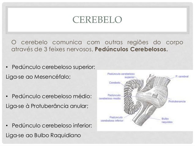 17. 17. CEREBELO O cerebelo comunica com outras regiões do corpo através de 3 feixes nervosos, Pedúnculos Cerebelosos. •Pedúnculo cerebeloso superior: Liga-se ao Mesencéfalo; •Pedúnculo cerebeloso médio: Liga-se à Protuberância anular; •Pedúnculo cerebeloso inferior: Liga-se ao Bulbo Raquidiano