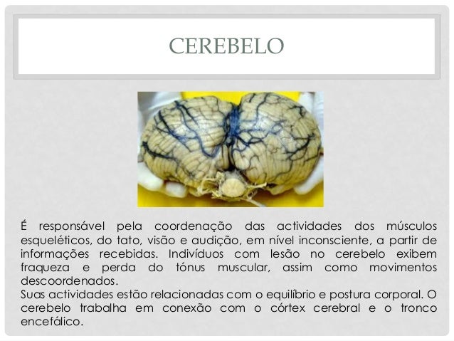 18. 18. CEREBELO É responsável pela coordenação das actividades dos músculos esqueléticos, do tato, visão e audição, em nível inconsciente, a partir de informações recebidas. Indivíduos com lesão no cerebelo exibem fraqueza e perda do tónus muscular, assim como movimentos descoordenados. Suas actividades estão relacionadas com o equilíbrio e postura corporal. O cerebelo trabalha em conexão com o córtex cerebral e o tronco encefálico.