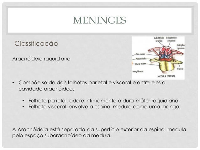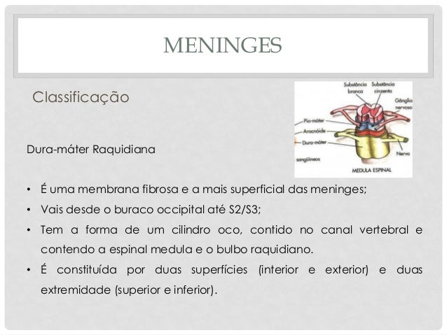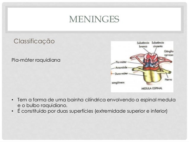 29. 29. Pia-máter raquidiana •Tem a forma de uma bainha cilíndrica envolvendo a espinal medula e o bulbo raquidiano. •É constituído por duas superfícies (extremidade superior e inferior) MENINGES Classificação