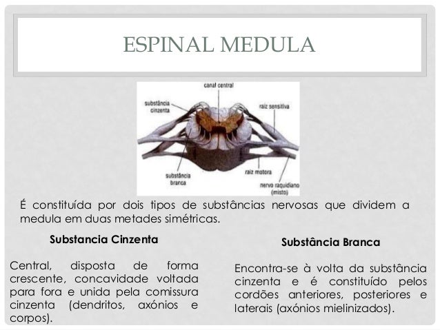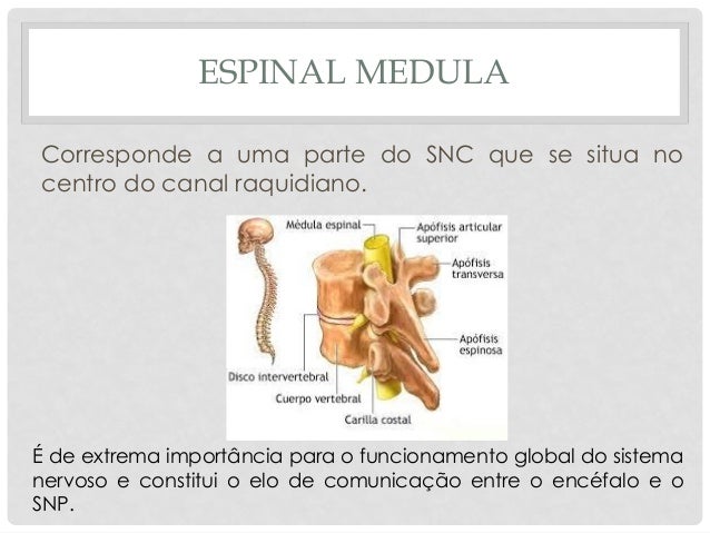 3. 3. ESPINAL MEDULA Corresponde a uma parte do SNC que se situa no centro do canal raquidiano. É de extrema importância para o funcionamento global do sistema nervoso e constitui o elo de comunicação entre o encéfalo e o SNP.