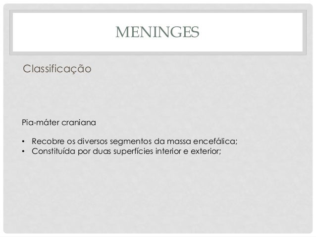 30. 30. Pia-máter craniana •Recobre os diversos segmentos da massa encefálica; •Constituída por duas superfícies interior e exterior; Classificação MENINGES