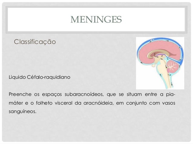 31. 31. Liquido Céfalo-raquidiano Preenche os espaços subaracnoídeos, que se situam entre a pia- máter e o folheto visceral da aracnóideia, em conjunto com vasos sanguíneos. MENINGES Classificação