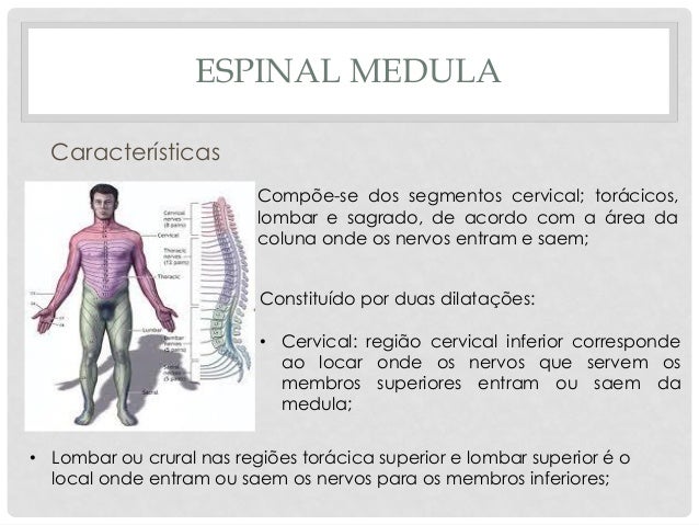 5. 5. Características Compõe-se dos segmentos cervical; torácicos, lombar e sagrado, de acordo com a área da coluna onde os nervos entram e saem; •Lombar ou crural nas regiões torácica superior e lombar superior é o local onde entram ou saem os nervos para os membros inferiores; Constituído por duas dilatações: •Cervical: região cervical inferior corresponde ao locar onde os nervos que servem os membros superiores entram ou saem da medula; ESPINAL MEDULA