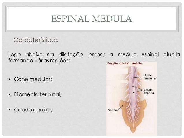6. 6. Características Logo abaixo da dilatação lombar a medula espinal afunila formando várias regiões: •Cone medular: •Filamento terminal; •Cauda equina; ESPINAL MEDULA