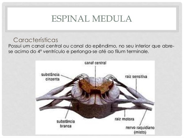 7. 7. Características Possui um canal central ou canal do epêndimo, no seu interior que abre- se acimo do 4º ventrículo e perlonga-se até ao filum terminale. ESPINAL MEDULA