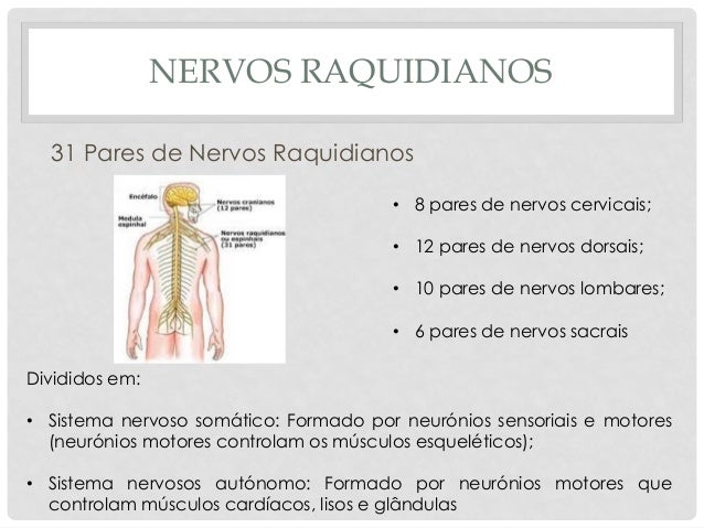 9. 9. NERVOS RAQUIDIANOS 31 Pares de Nervos Raquidianos •8 pares de nervos cervicais; •12 pares de nervos dorsais; •10 pares de nervos lombares; •6 pares de nervos sacrais Divididos em: •Sistema nervoso somático: Formado por neurónios sensoriais e motores (neurónios motores controlam os músculos esqueléticos); •Sistema nervosos autónomo: Formado por neurónios motores que controlam músculos cardíacos, lisos e glândulas
