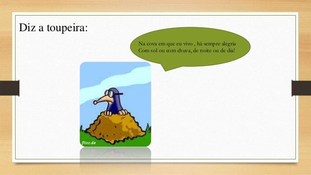 11. 11. Diz a toupeira: Na cova em que eu vivo , há sempre alegria Com sol ou com chuva, de noite ou de dia!