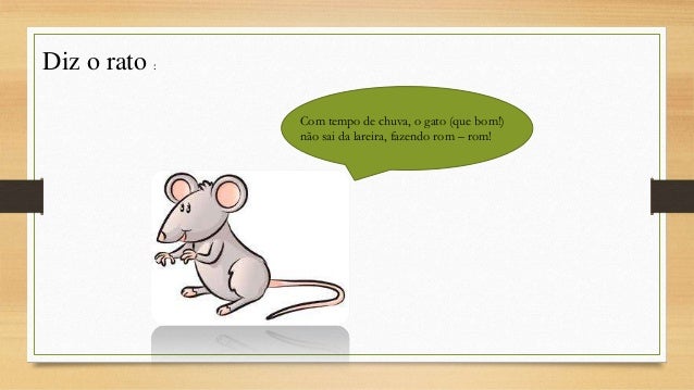 5. 5. Diz o rato : Com tempo de chuva, o gato (que bom!) não sai da lareira, fazendo rom – rom!