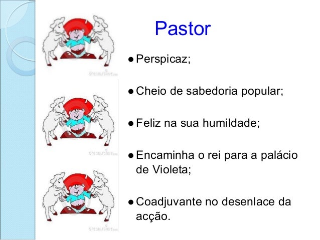 10. 10. Pastor● Perspicaz;● Cheio de sabedoria popular;● Feliz na sua humildade;● Encaminha o rei para a palácio de Violeta;● Coadjuvante no desenlace da acção.