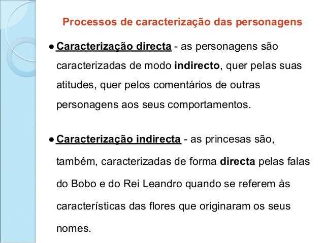 11. 11. Processos de caracterização das personagens● Caracterização directa - as personagens são caracterizadas de modo indirecto, quer pelas suas atitudes, quer pelos comentários de outras personagens aos seus comportamentos.● Caracterização indirecta - as princesas são, também, caracterizadas de forma directa pelas falas do Bobo e do Rei Leandro quando se referem às características das flores que originaram os seus nomes.